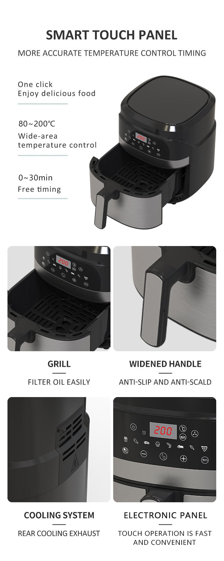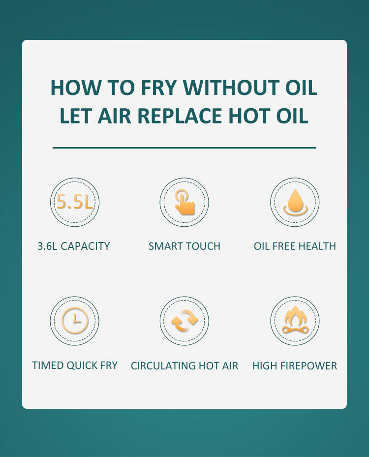 Tugann an YYZG-550A, painéal ceannródaíoch 5.5L, an t-amadóir teochta digiteach a rialú aeir. Bain sult as an gcumhacht a bhaineann le huainiú neamhthruaillithe, idir 0 agus leath uair an chloig, ag ceadú duit tréimhsí bácála a shaincheapadh gan stró. Cinntíonn an dromchla cócaireachta neamh-bata ardcháilíochta glanadh éasca, ag an am céanna leis an 8 mbiachlár cliste a shimpliú. Tá dáileadh tapa agus fiú an t -aer te mar thréith dá phróiseas cócaireachta, ag díol torthaí níos sláintiúla le níos lú ola. Feabhsaíonn an struchtúr tarraiceán taitneamhach úsáideora compord, ag éascú luchtú saor ó thrioblóid agus díluchtú na miasa is fearr leat. $ $ $
